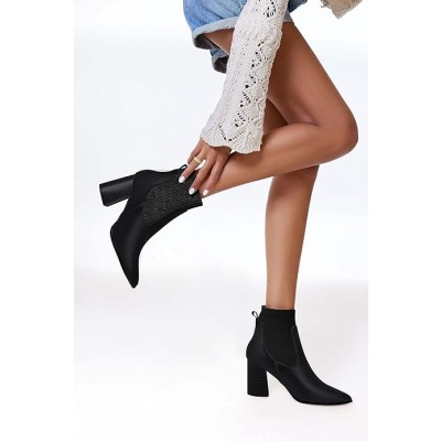 Women Pointed Toe Ankle Boots Knit Sock Boot Chunky Block Stacked Mid Heel Comfortable Chelsea Booties Shoes