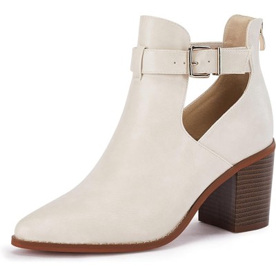 Womens Cutout Buckle Strap Ankle Boots Pointed Toe Chunky Block Heel Back Zipper Booties