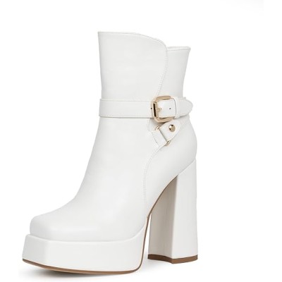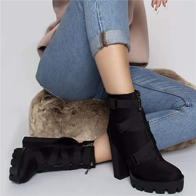 Women's Fashion Platform Block High Heel Booties Buckle Strap Zipper