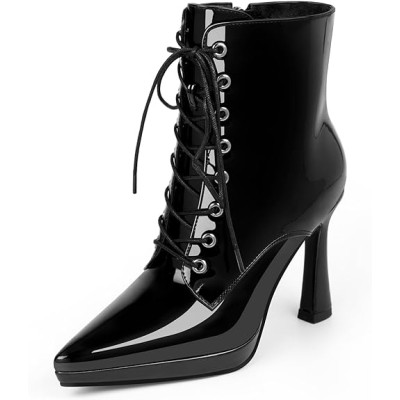 Women's Boots Pointed Toe Platform Patent Leather Side Zipper Lace Up High Stiletto Heel Booties